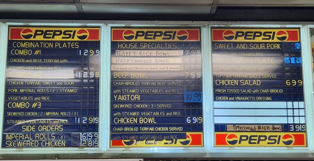 - House Specialties: Signature items like the Happy Rice Bowl featuring prawns, chicken, and beef over steamed vegetables and rice for $11.99 shine here.